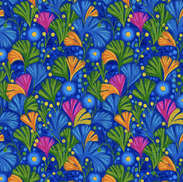 Every motif feels alive, bursting from rich blue nightscapes like a midnight garden dreaming in Technicolor. There’s citrus in the sky, flowerbeds made of firelight, and blossoms that refuse to whisper.